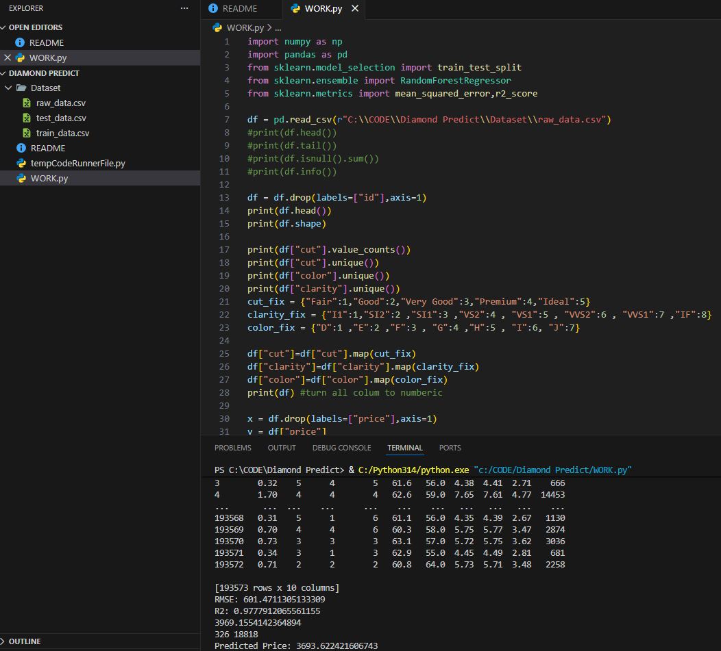 Applied Random Forest Regression to predict diamond prices with proper data cleaning and preprocessing.